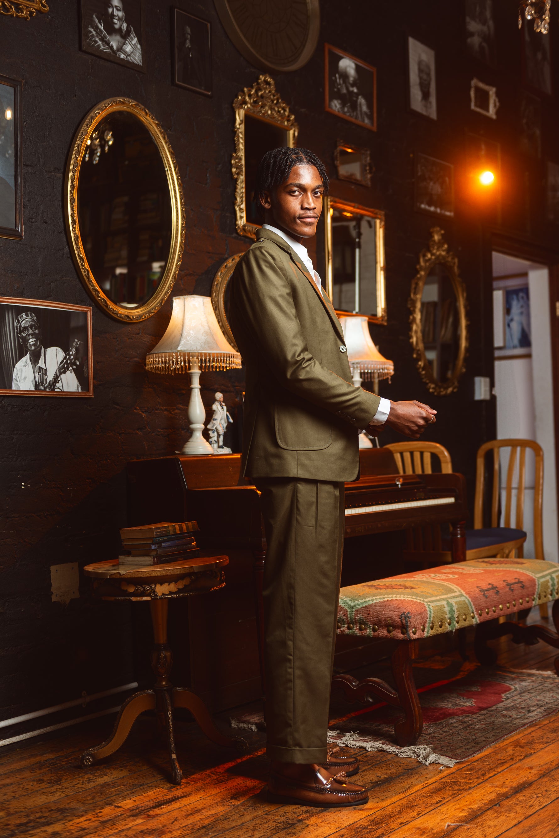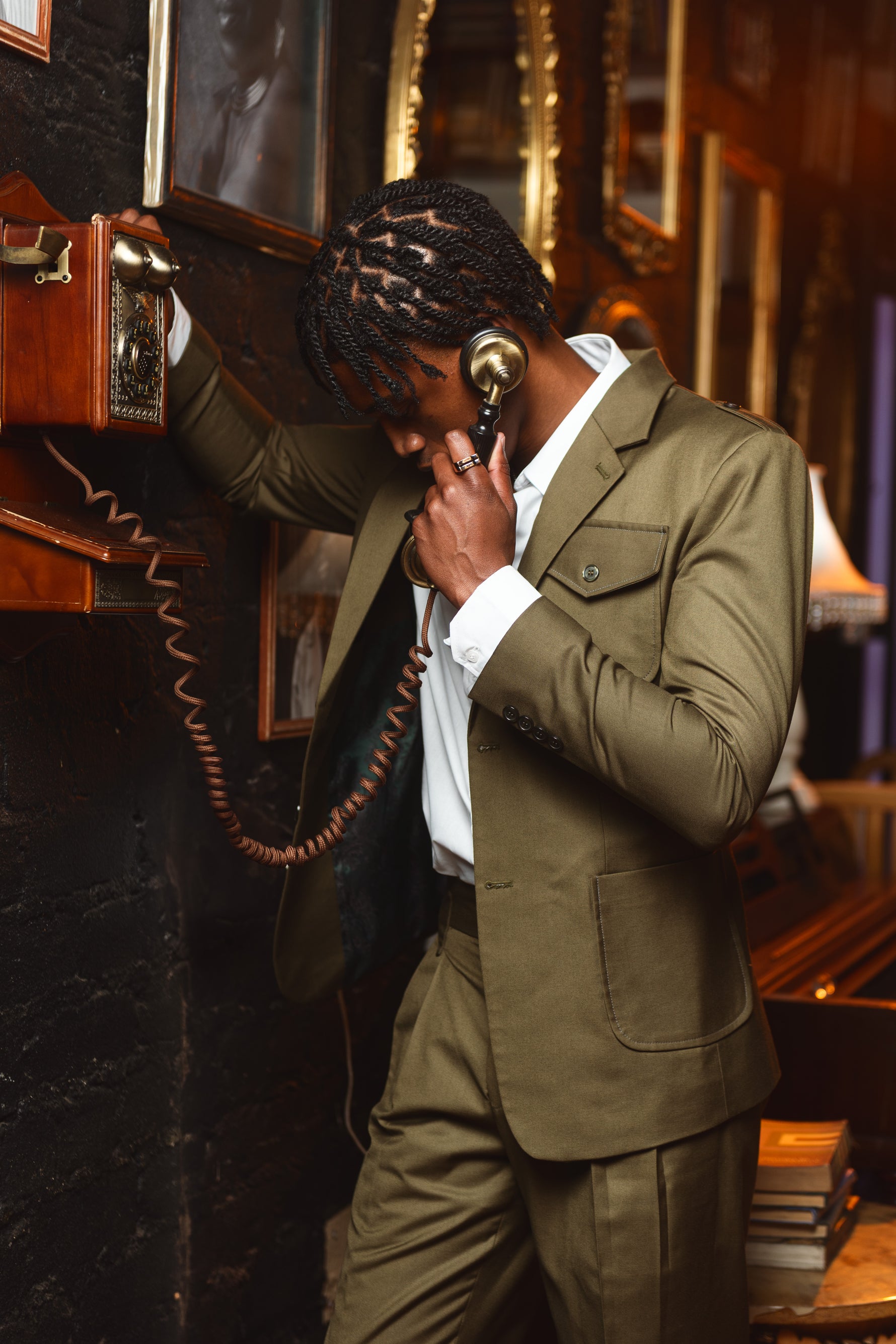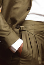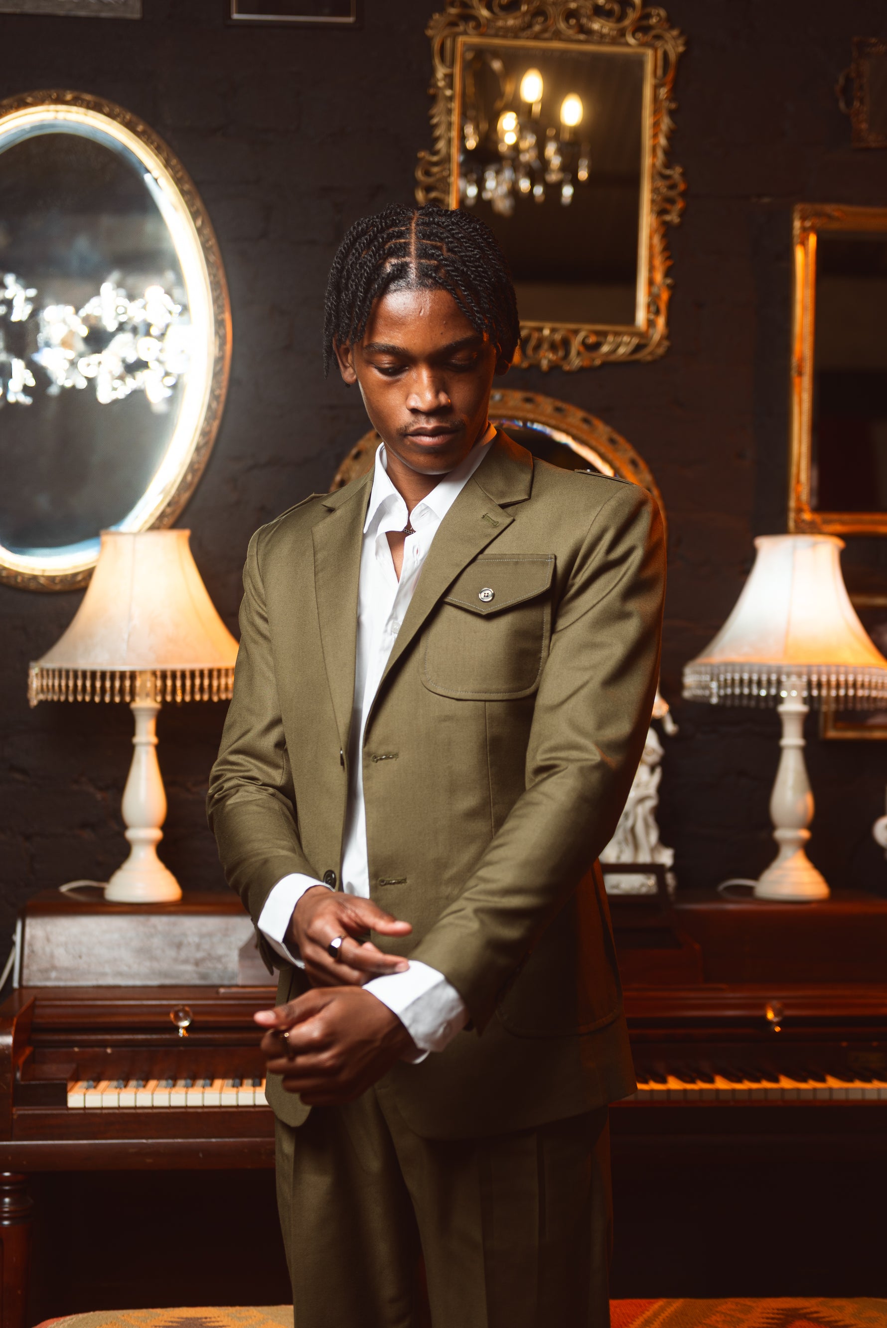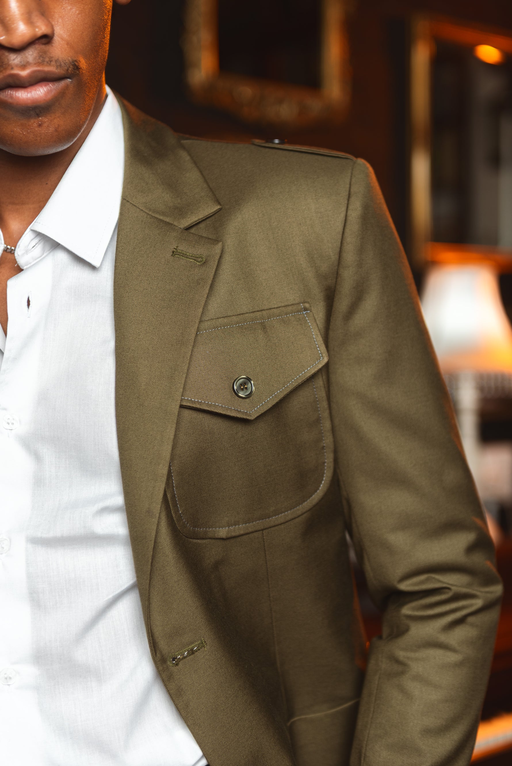 deep military green. The blazer is accented with three